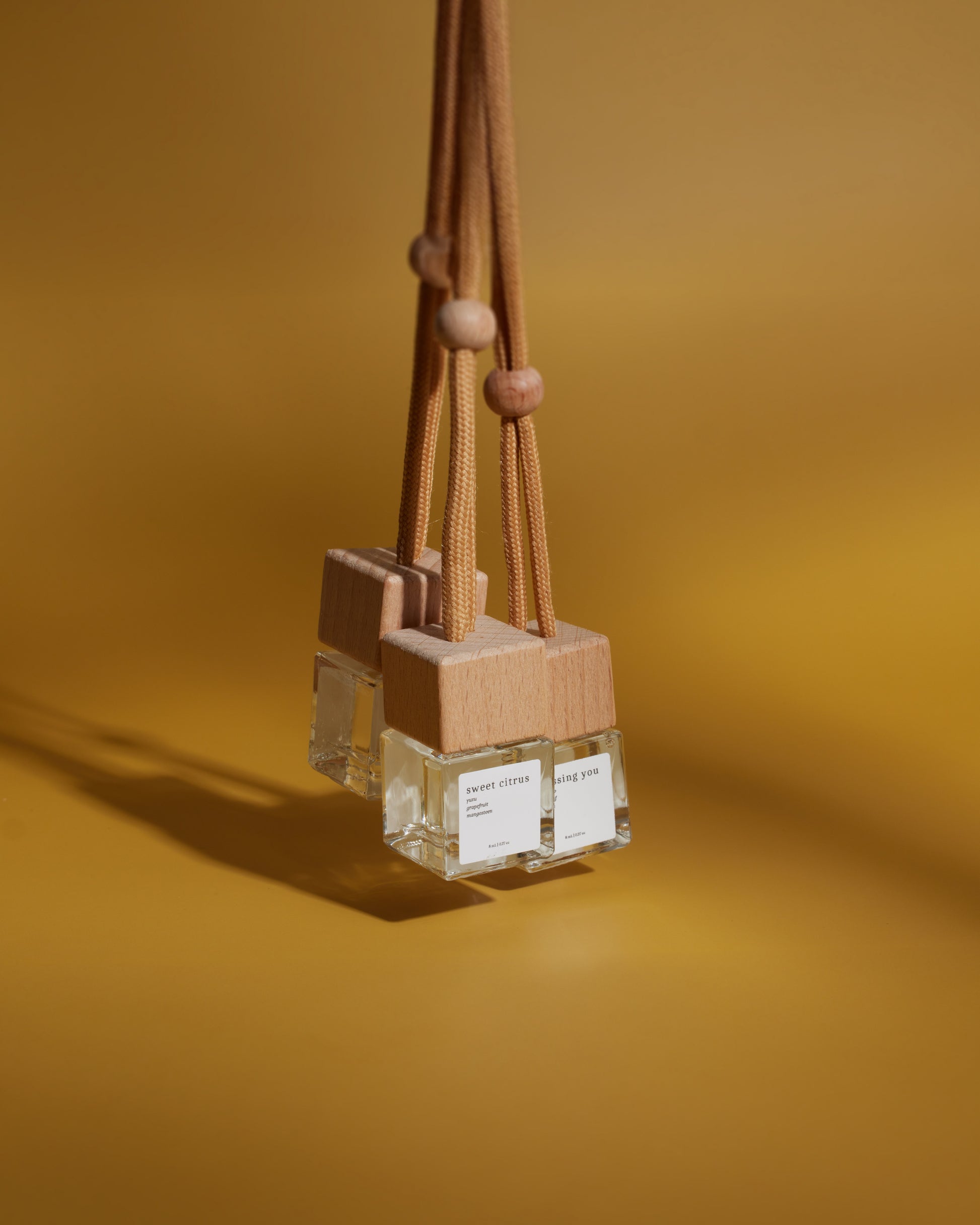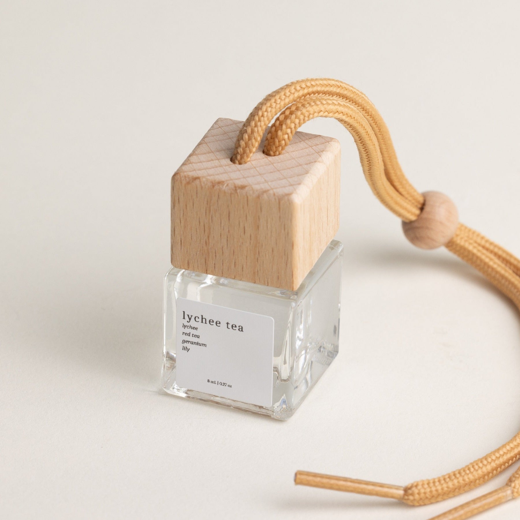 Our car diffusers are made with a 50/50 blend of diffuser carrier oil and high quality, phthalate-free fragrances. All these ingredients are skin-safe. While it's not intended for topical use, you also won't have to worry about it being toxic. The car diffuser bottles are clear glass vials, topped with a natrual wood cap.